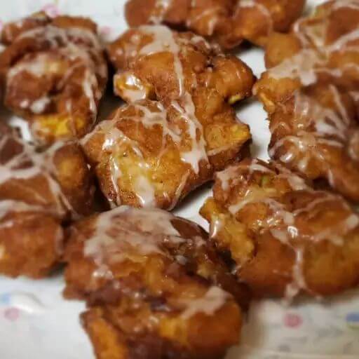 -Preheat the oven’s broiler. Whisk together confectioner’s sugar, milk, and vanilla extract. Brush a thin layer of glaze over fritters, and place under broiler.