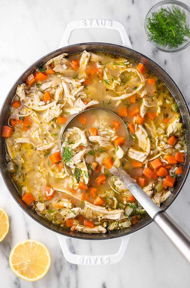 Stir in cooked chicken and rice and cook for another 5 minutes. Stir in lemon juice, dill, and Parmesan cheese. Taste soup and adjust seasoning, if needed.