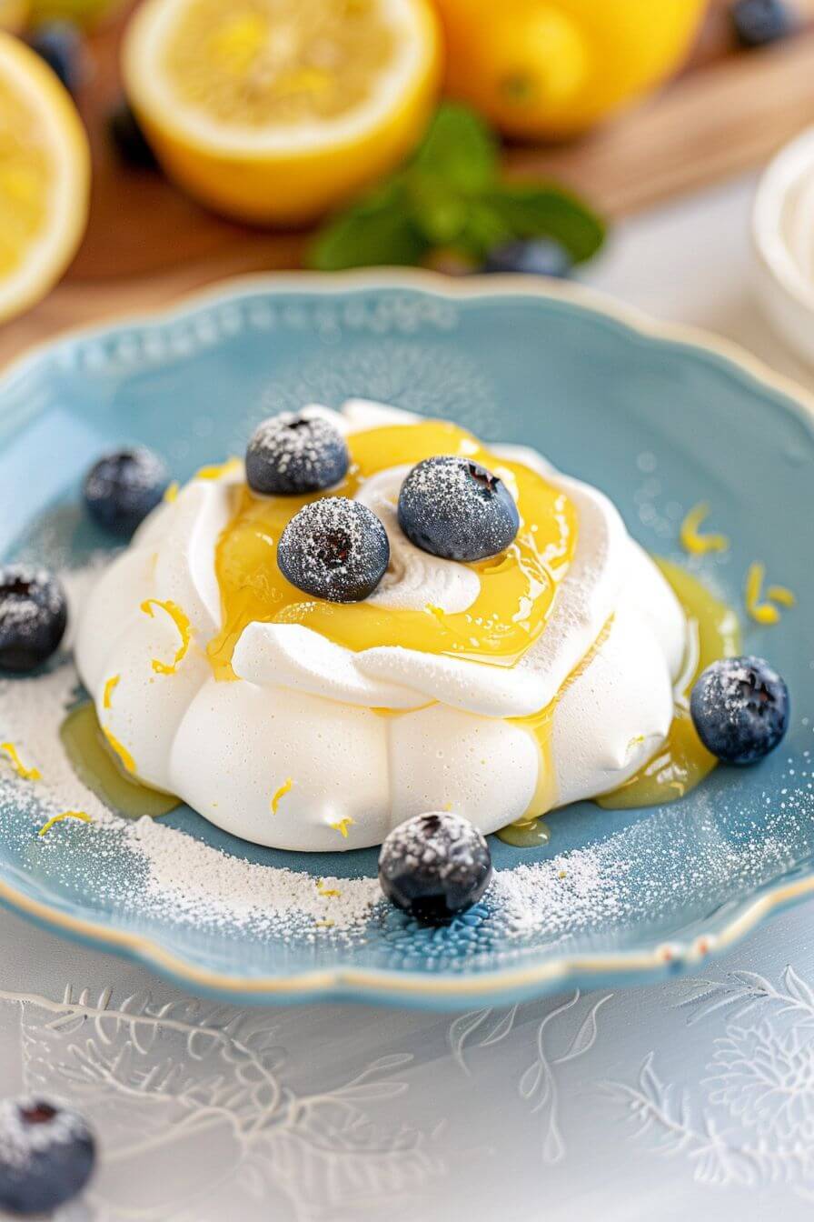 - Once cooled, spoon lemon curd into the center of each meringue.