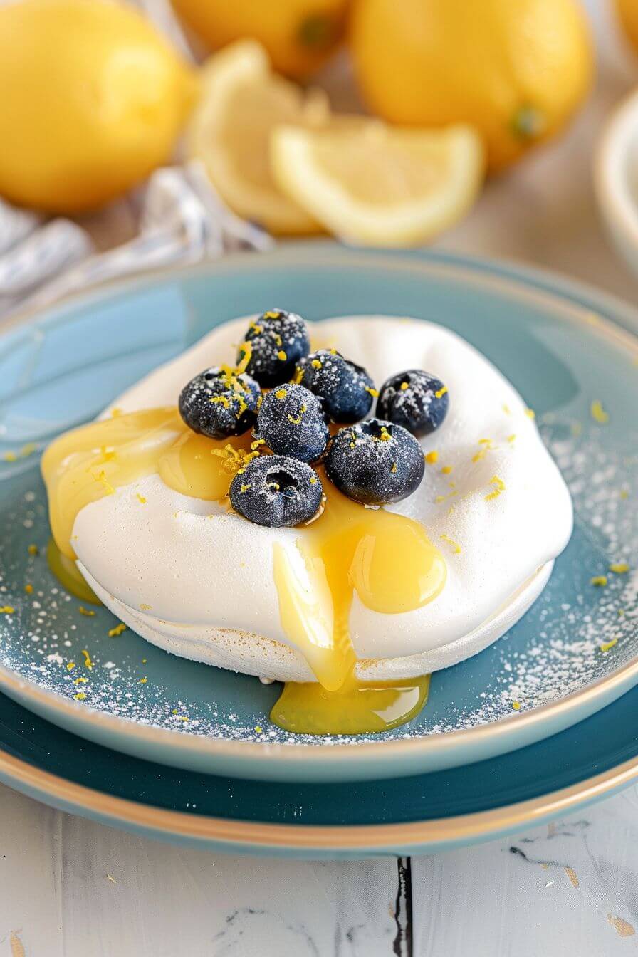 - Once cooled, spoon lemon curd into the center of each meringue.