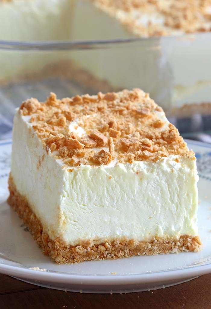 Spread filling over the crust and sprinkle with reserved graham cracker crumbs on top.