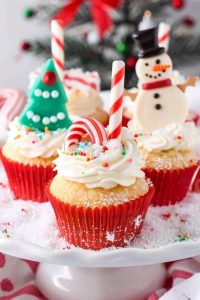 They’re soft, fluffy, just rich enough without being heavy, and topped with a swirl of snowy frosting that practically begs for sprinkles. And then — the candy cane. That little red-and-white pole turns a regular cupcake into something kids genuinely light up over.