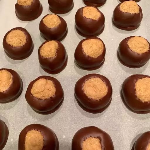 -Combine confectioners’ sugar, peanut butter, butter, and vanilla in a large bowl; mix together with your hands to form a smooth stiff dough. Shape into balls using 2 teaspoons of dough for each ball. Place on the prepared baking sheet and refrigerate until ready to coat with chocolate.