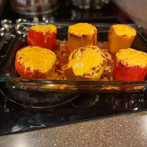 -Spoon the mixture into the pepper shells halfway and sprinkle with a little cheese. Fill the rest of the way and mound it on top then sprinkle with more cheese.